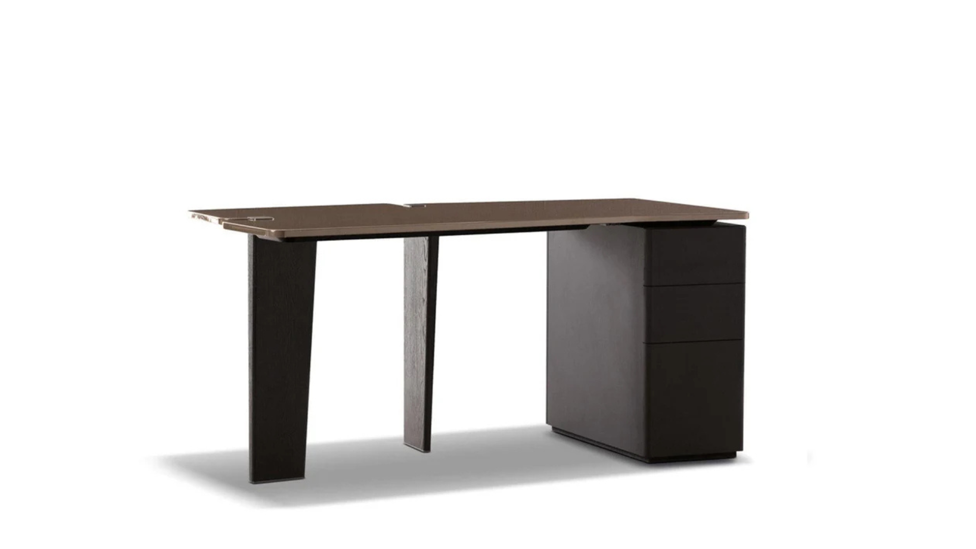 A wide geometric design surface in natural oak wood in black or oil grey paint, supported on two sides, one with straight black wooden legs and the other containing a built-in drawer unit with three levels. The base is equipped with edges made of stainless-steel, resistant to rust, in titanium colour.