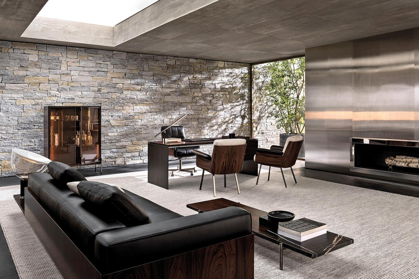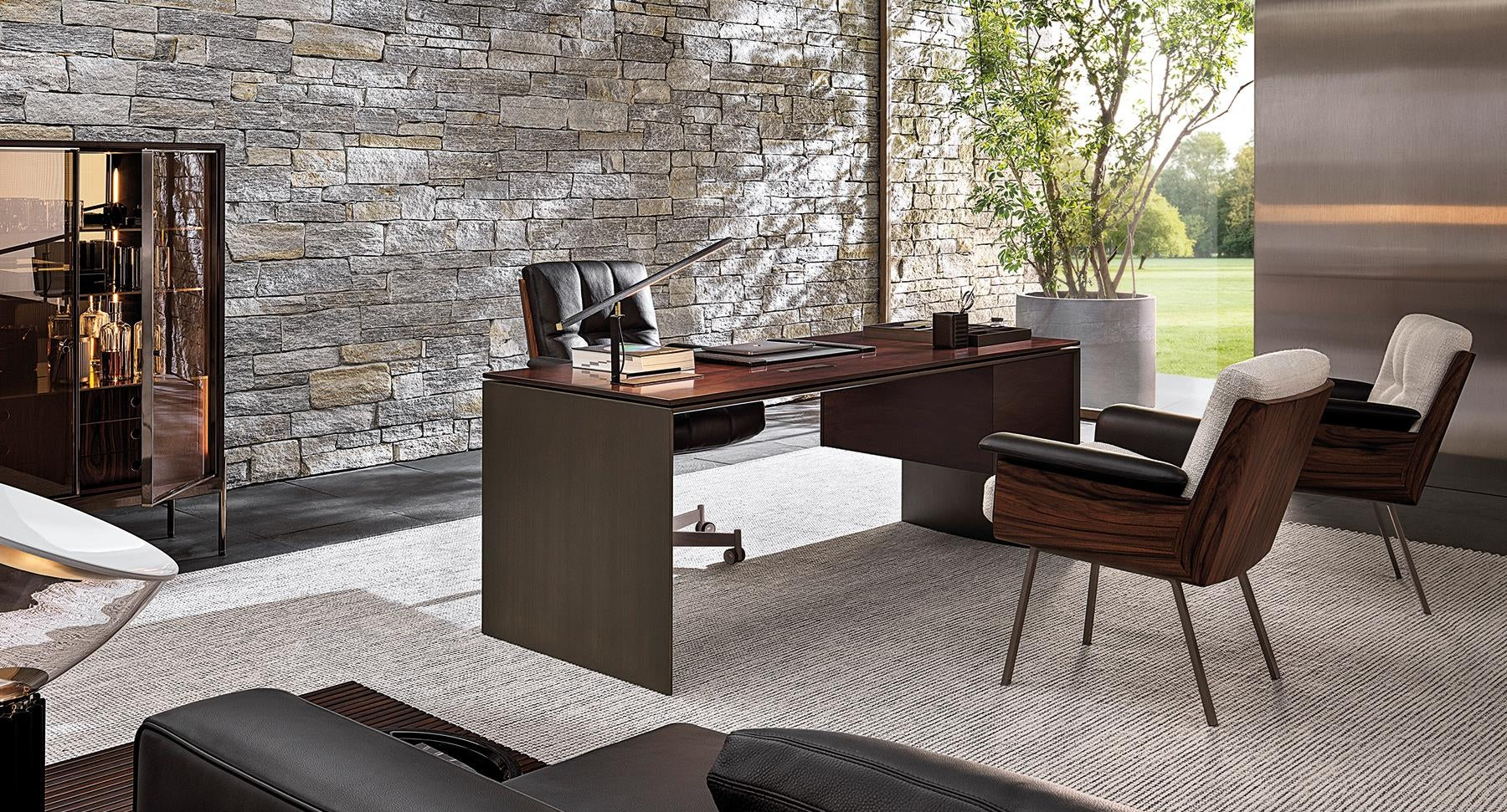 Rectangular table with a top made of natural rosewood, multi-layered, two side drawers, and straight legs made of stainless-steel in titanium gray.