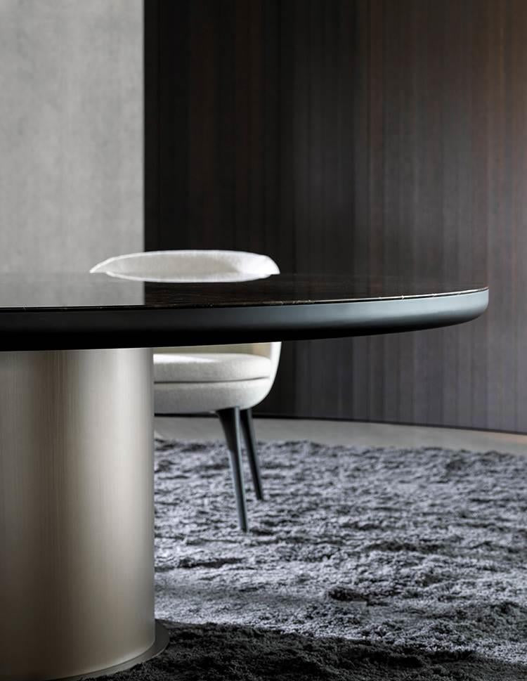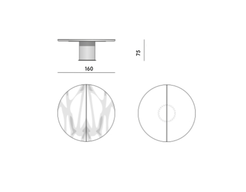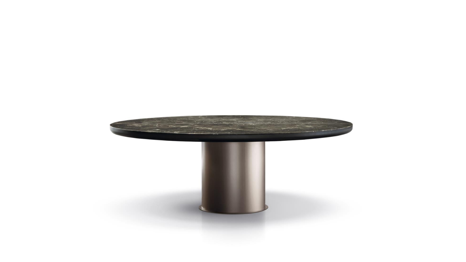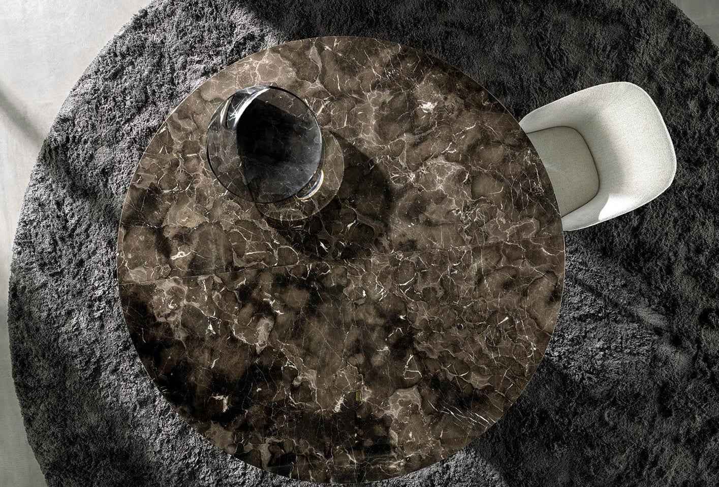 طاولة دائرية بسطح املس بتصميم عصري مصنوعة من رخام طبيعي إيطالي عالي الجودة مع خيارات متعددة من انواع الرخام حسب اختيارك وقاعدة أسطوانية توفر ثبات ودعم قوي من الستانلس ستيل المقاوم للصدأ بلون برونزي