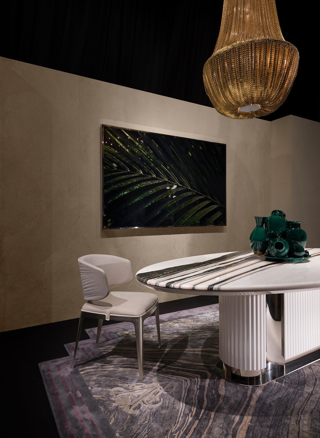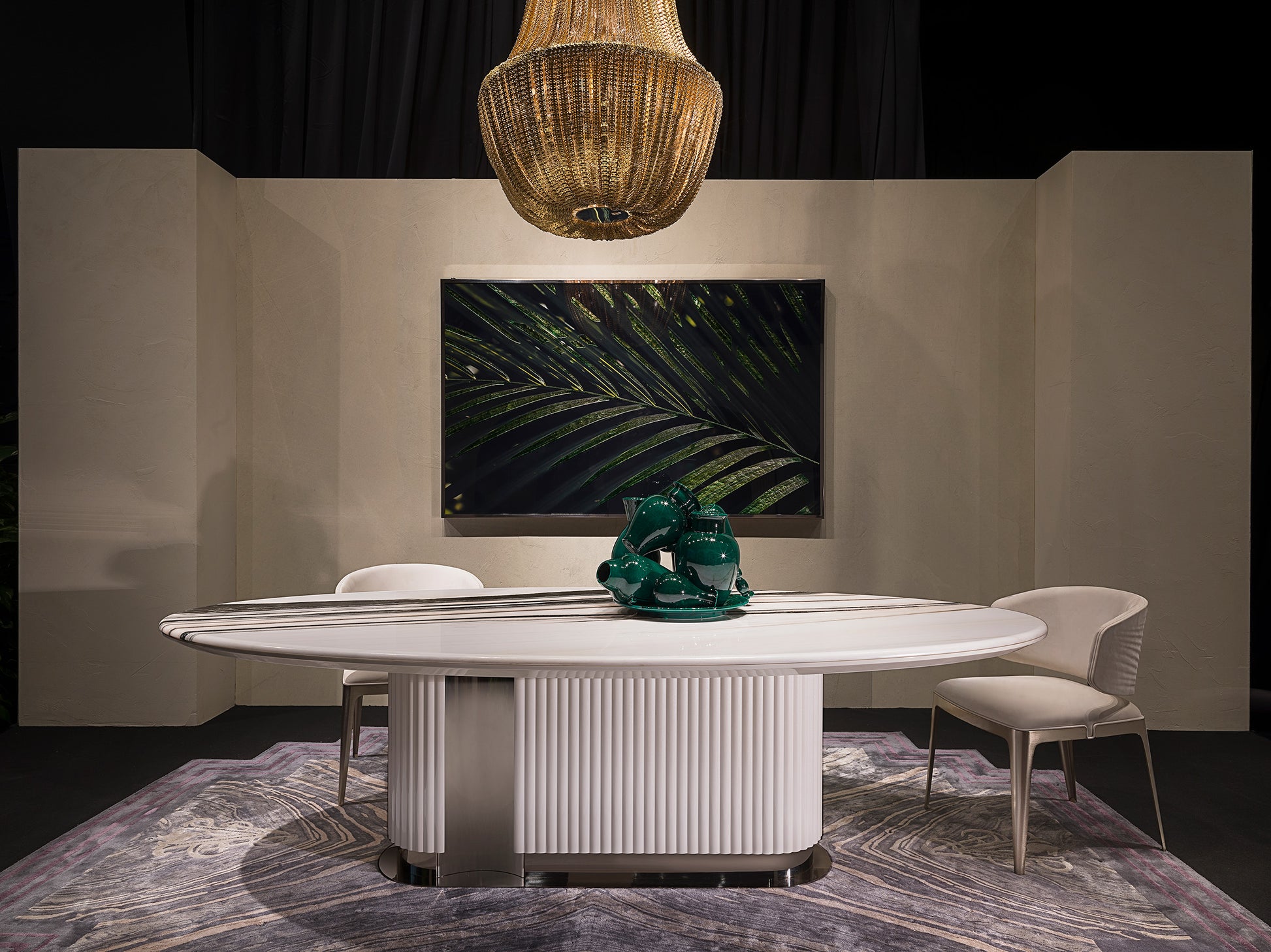 طاولة بيضاوية مصنوعة من الرخام الإيطالي الطبيعي بتشطيب لامع وبتفاصيل حواف دقيقة قاعدة الطاولة تتكوّن من هيكل أسطواني خشبي محدد بملمس رأسي مميز مدعّم بإطار من الستانلس ستيل المقاوم لصدا بلون الشمبانيا الذهبي يعزز من ثبات ومتانة الطاولة