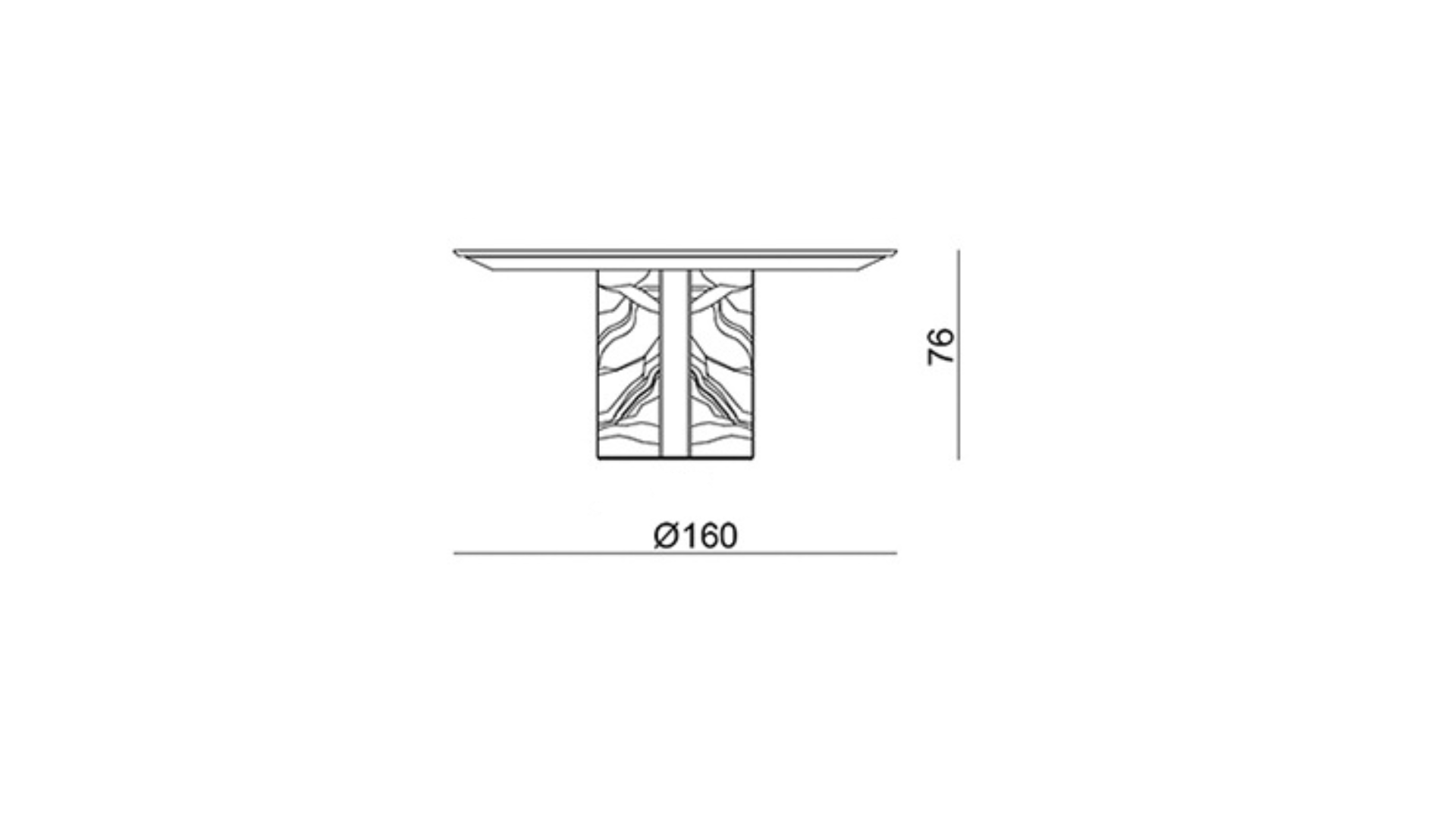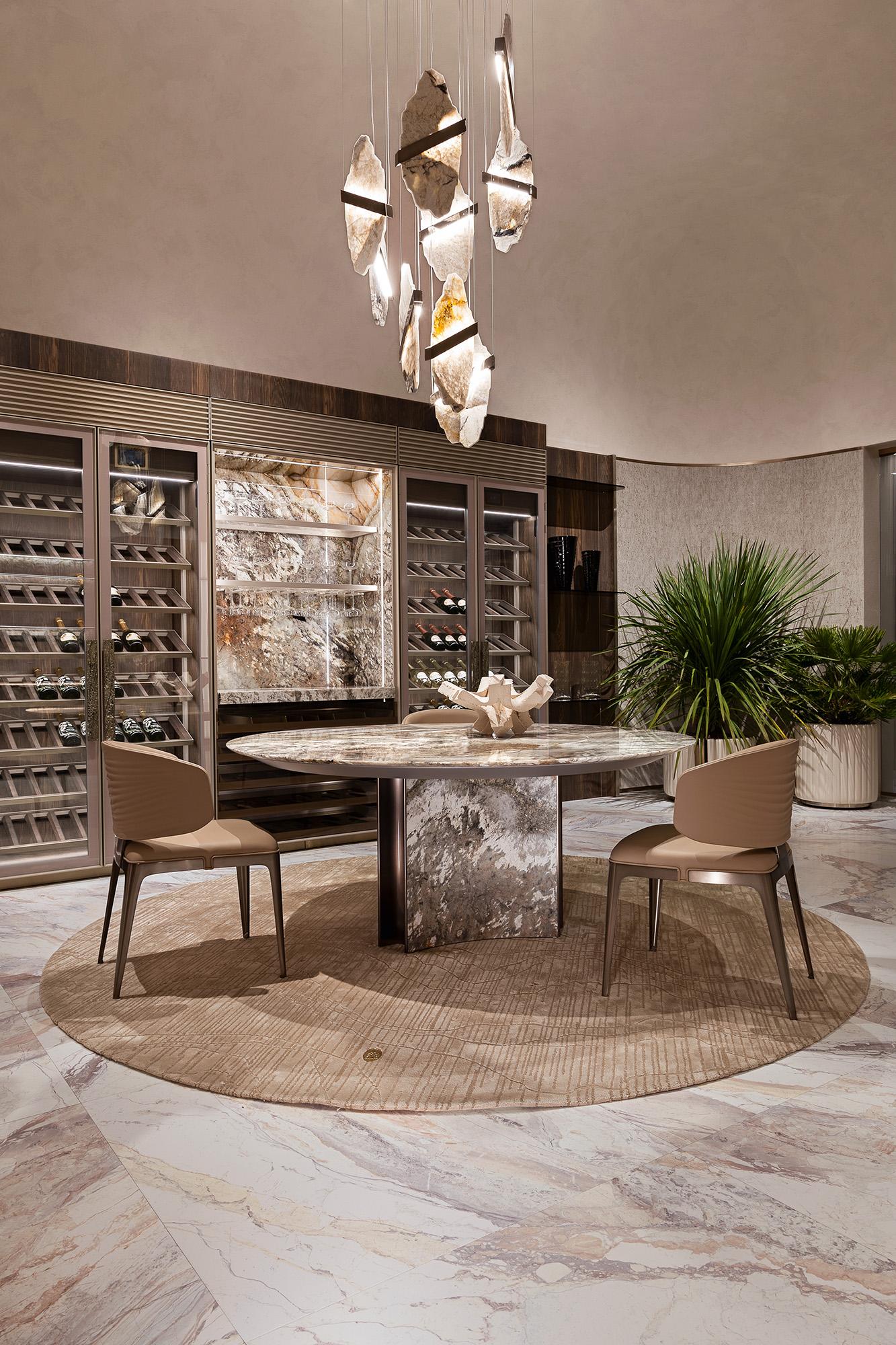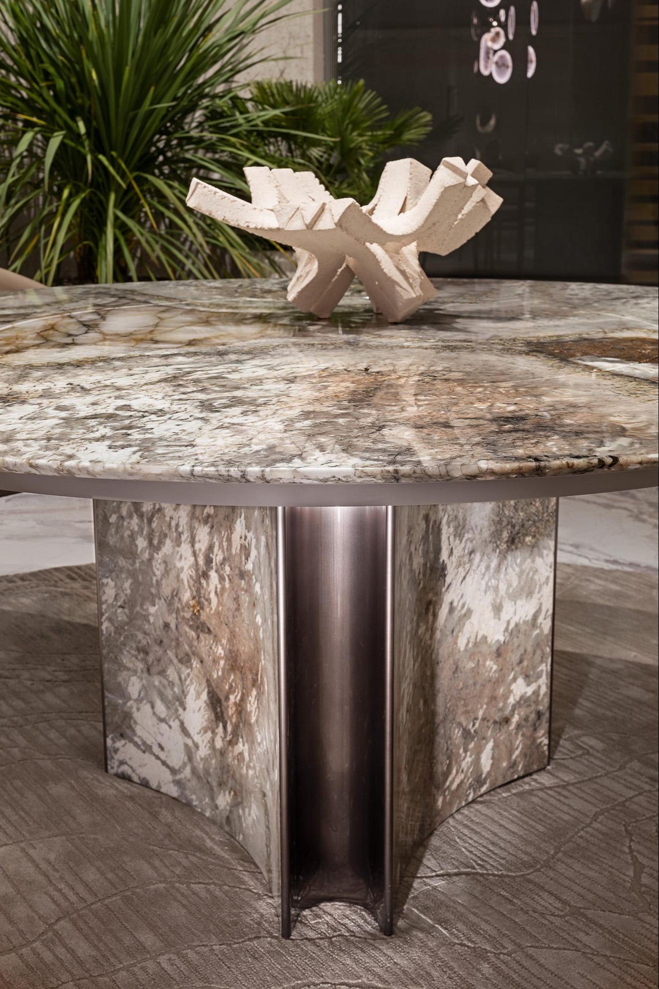طاولة دائرية مصنوعة بالكامل من الرخام الإيطالي الطبيعي بنمط متداخل غني بالتفاصيل اللونية مع حواف مدوّرة بدقة عالية القاعدة أسطوانية الشكل مدعّمة بعناصر معدنية داخلية لتعزيز الثبات والمتانة تتكوّن من أربعة ألواح رخامية متقاطعة من الستانلس ستيل المقاوم لصدا بلون النحاس الذهبي