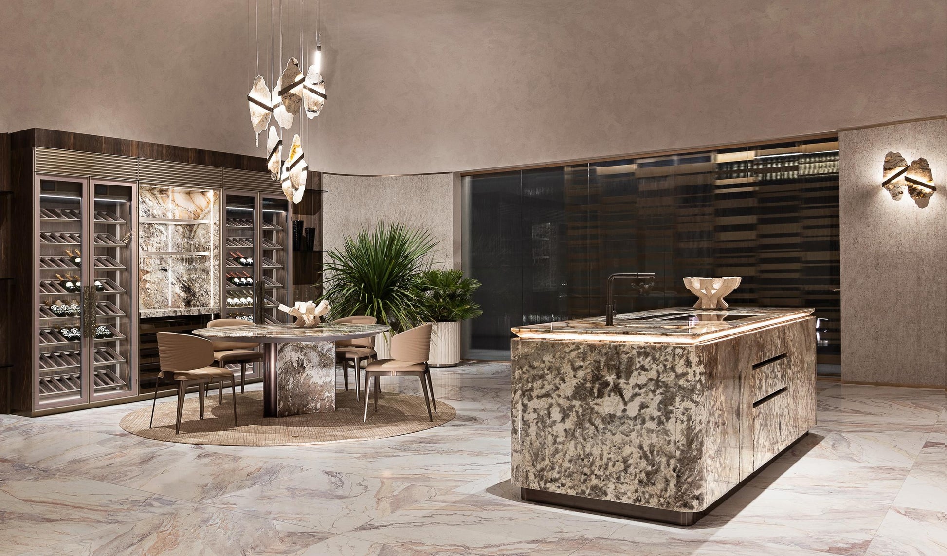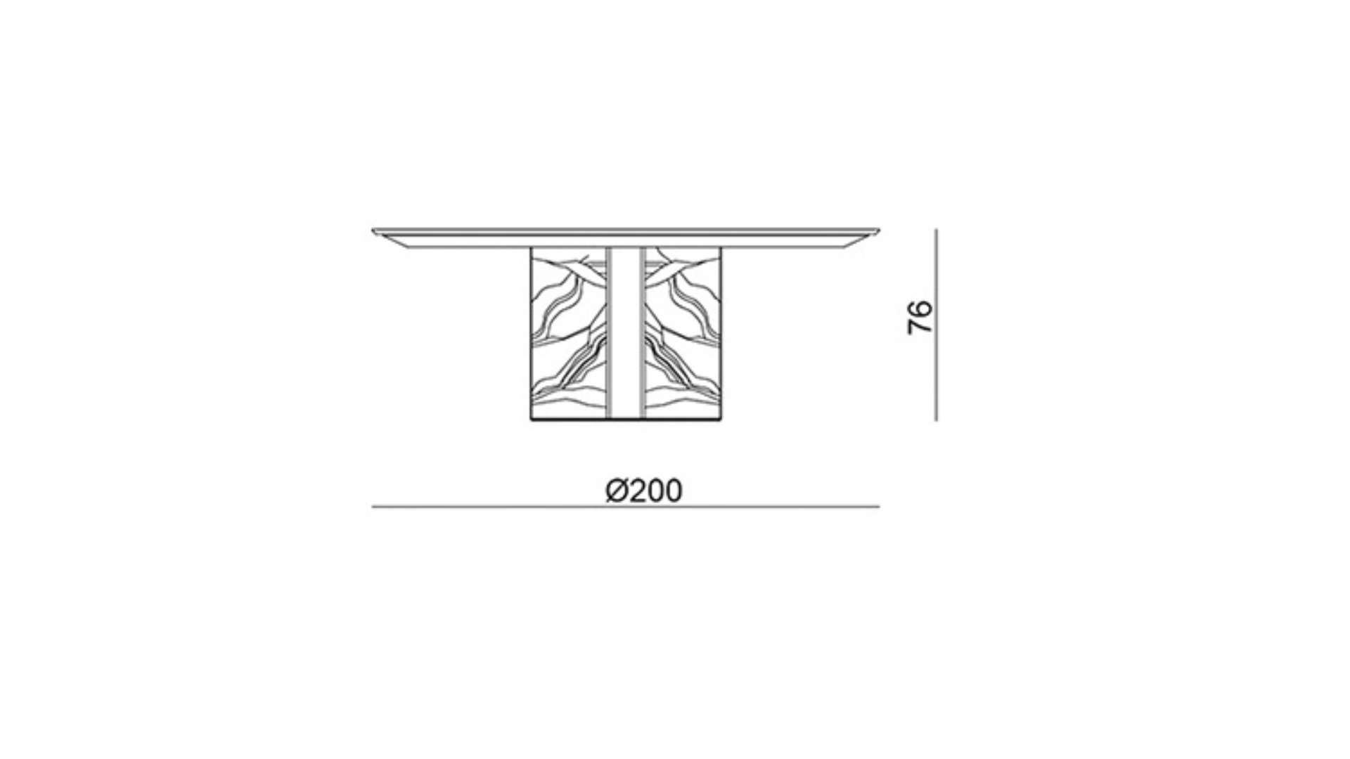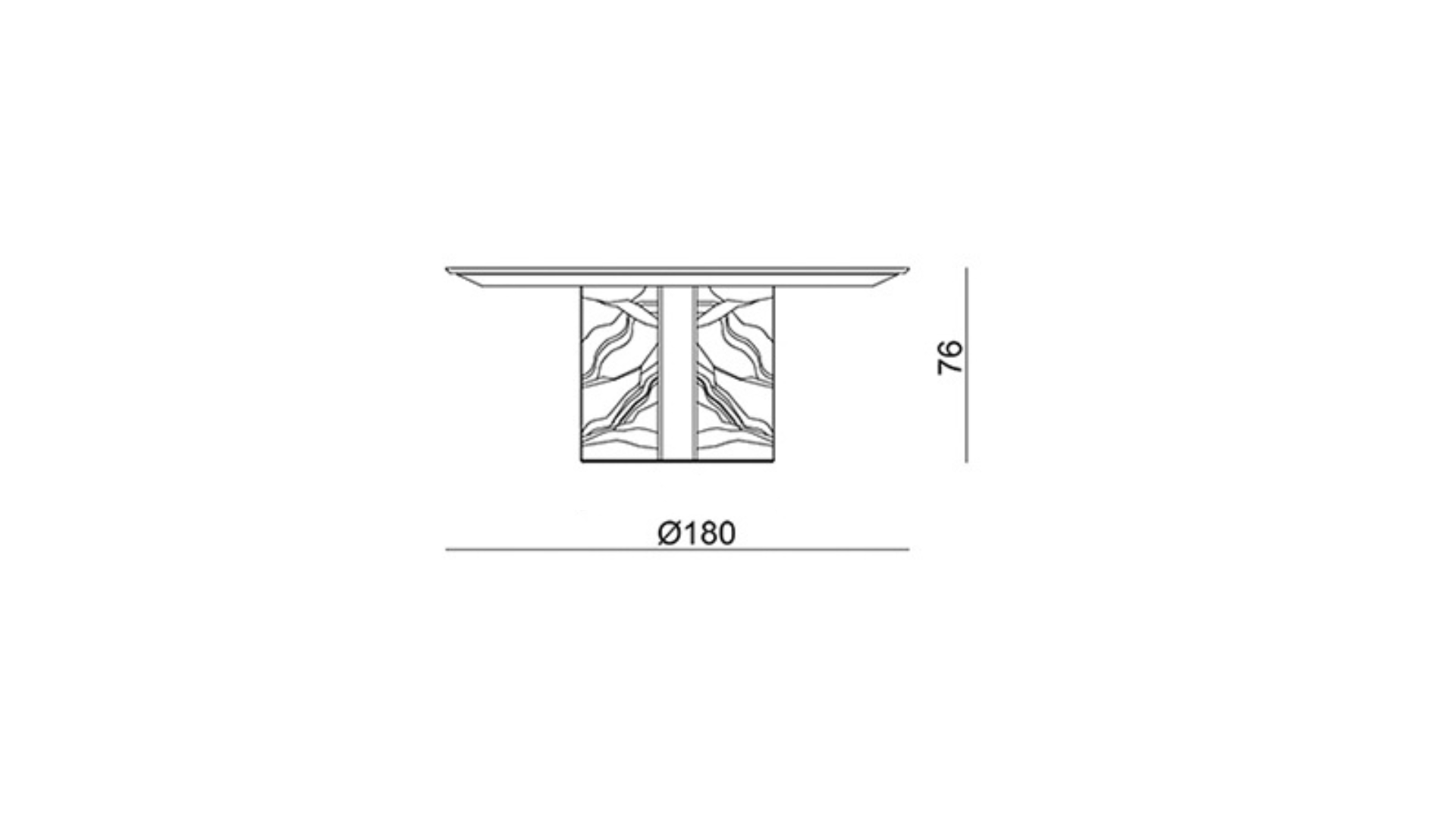 طاولة دائرية مصنوعة بالكامل من الرخام الإيطالي الطبيعي بنمط متداخل غني بالتفاصيل اللونية مع حواف مدوّرة بدقة عالية القاعدة أسطوانية الشكل مدعّمة بعناصر معدنية داخلية لتعزيز الثبات والمتانة تتكوّن من أربعة ألواح رخامية متقاطعة من الستانلس ستيل المقاوم لصدا بلون النحاس الذهبي