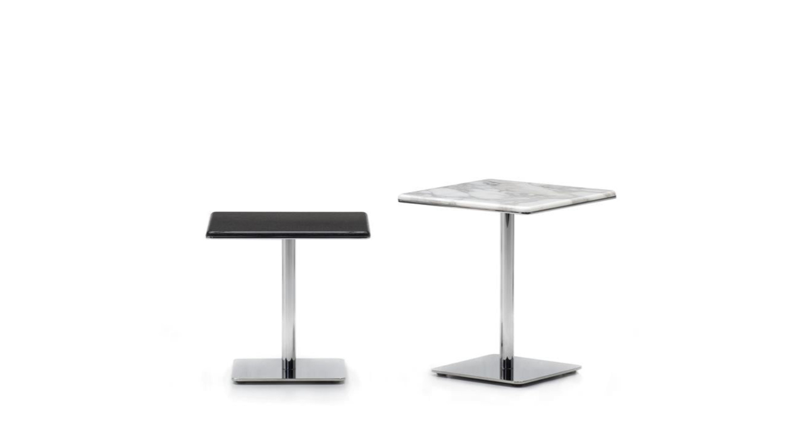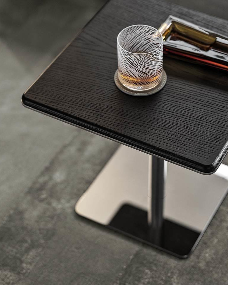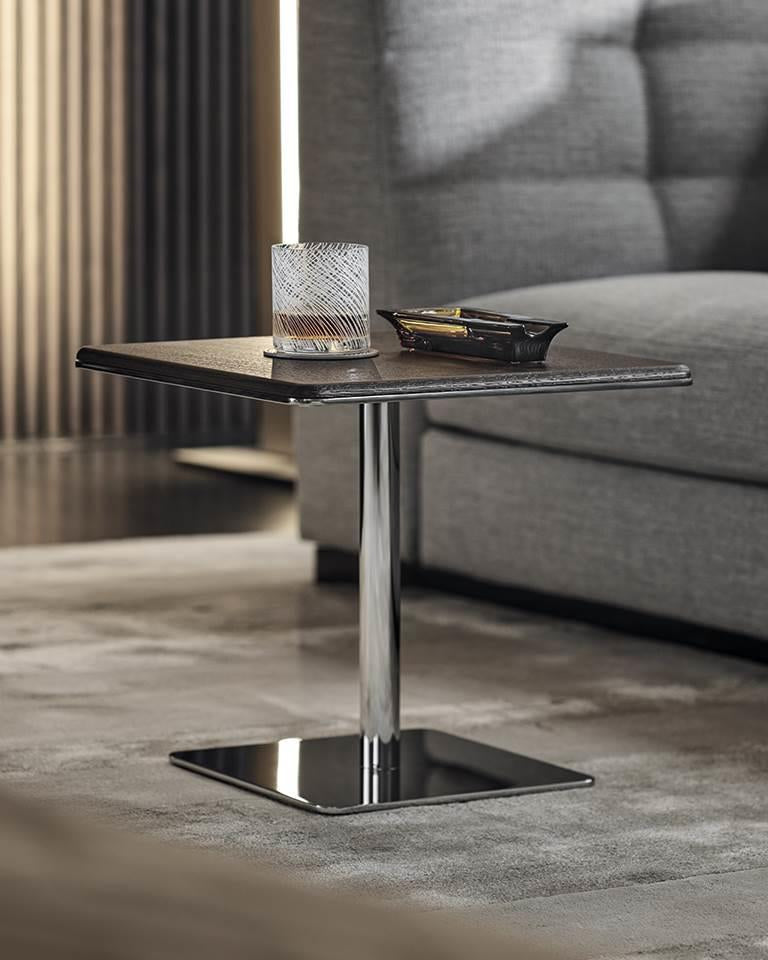 طاولة سطحها مربع مصنوعة من رخام طبيعي إيطالي عالي الجودة مع خيارات متعددة من انواع الرخام حسب اختيارك او من خشب اسود طبيعي الأرجل و القاعدة مصنوعة من الستانلس ستيل المقاوم لصدا بلون كروم لامع