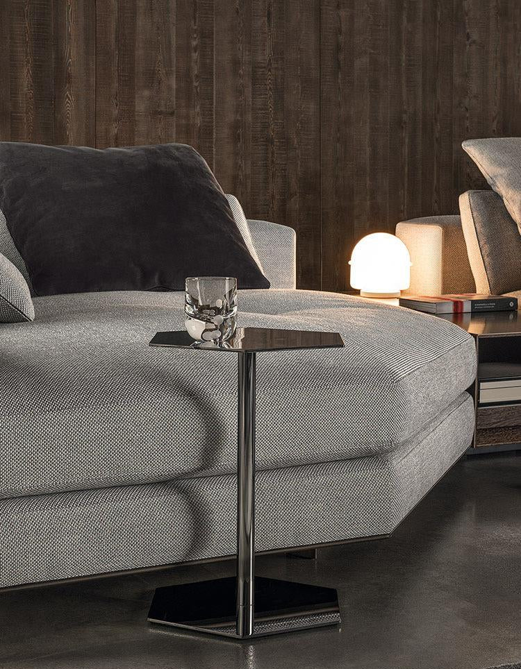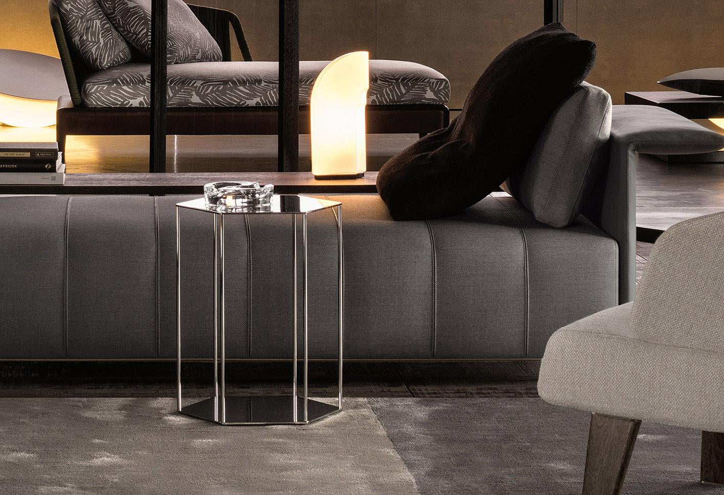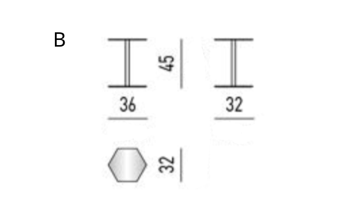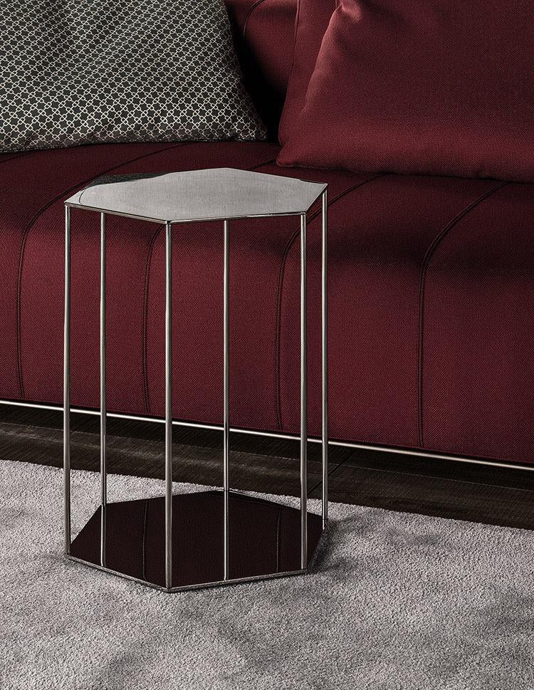 طاولة بخيارين مصنوعة بالكامل من الستانلس ستيل المقاوم لصدا بلون كروم لامع السطح والسقف سداسي الشكل الطاولة الأولى لها إطار مفتوح مصنوع من قضبان سداسية الشكل الطاولة الثانية لها عامود مركزي مستدير وقاعدة سداسية