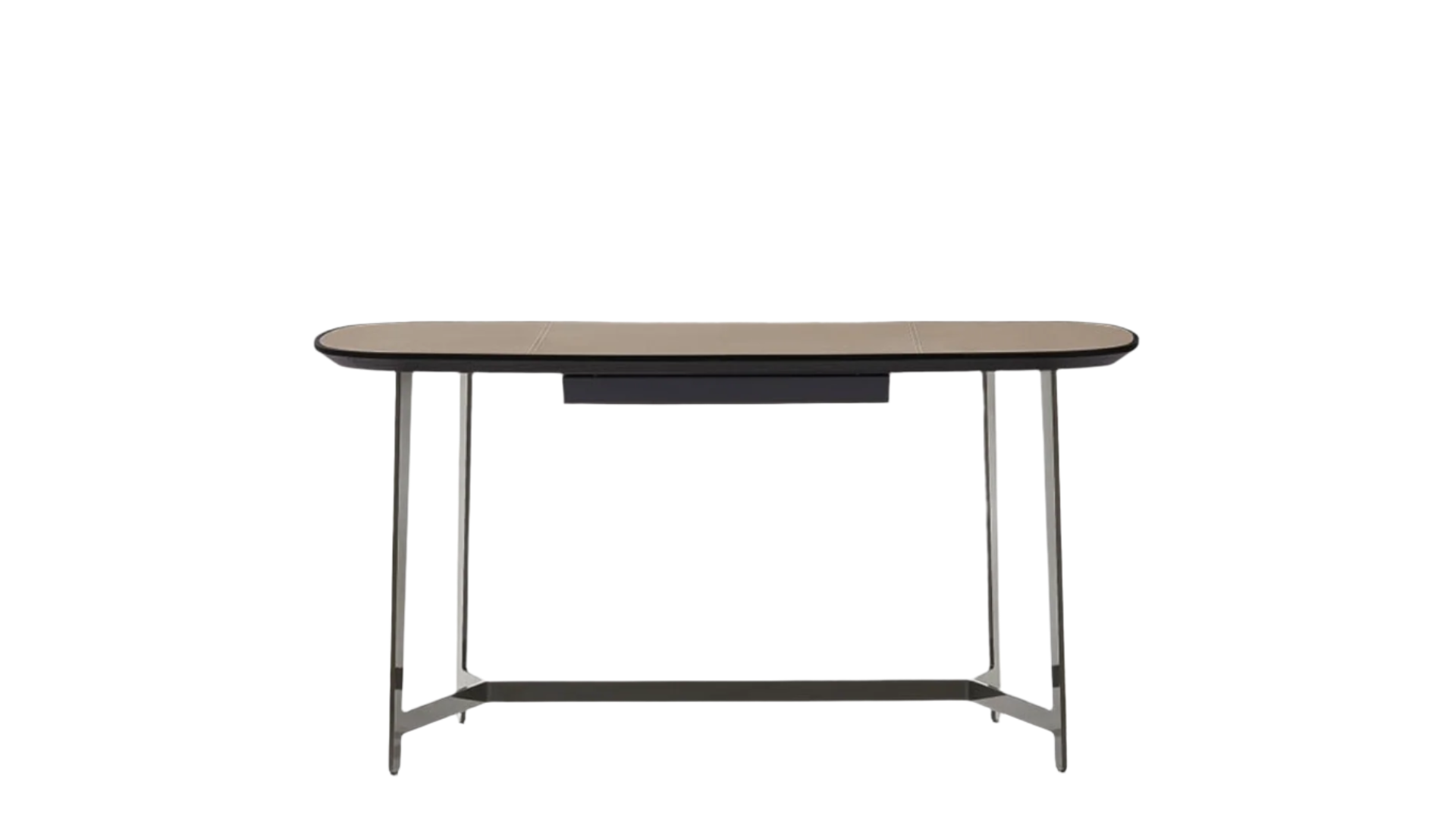 طاولة مستطيلة الشكل سطح الطاولة مغطى بطبقة جلد و اطرافها من قشرة خشب البلوط البني المدخن او من الخشب كاملة و ارجل الطاولة مصنوعة من الستانلس ستيل المقاوم لصدأ بلون التيتانيوم الرمادي مستقيمة التصميم يحتوي على درج مخفي