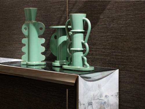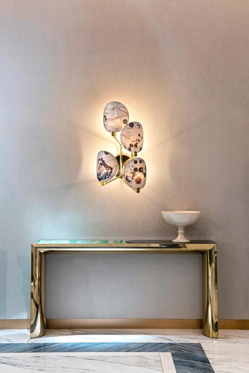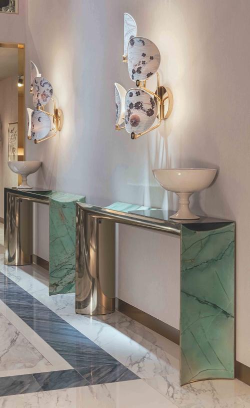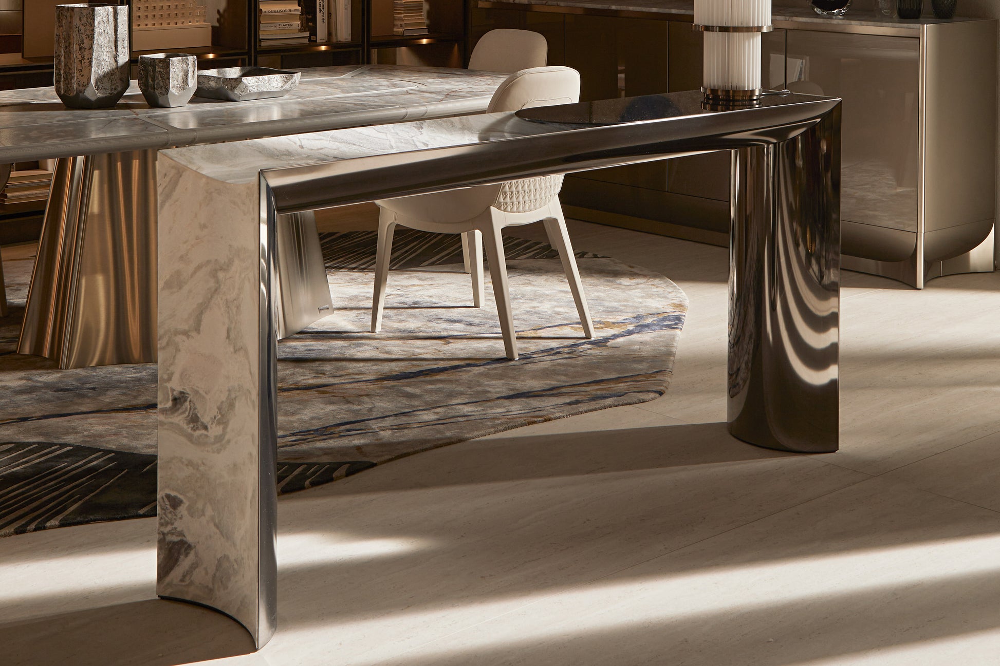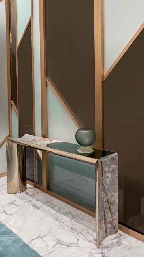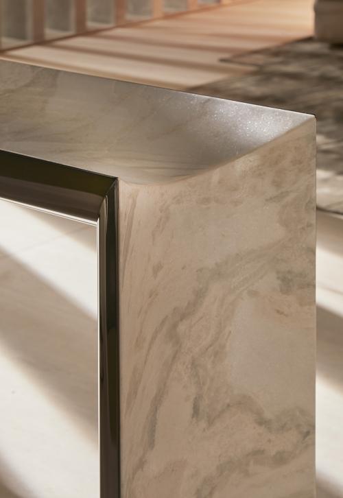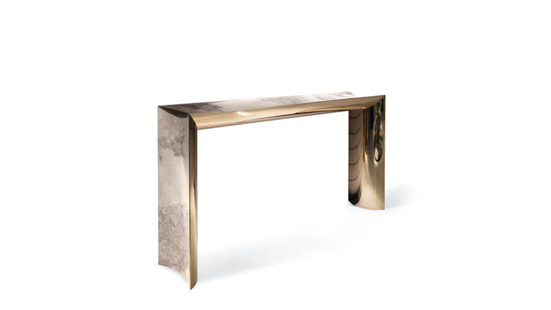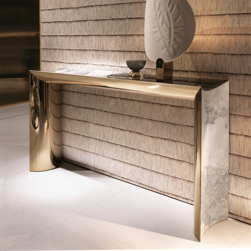 كونسول بتصميم انسيابي مكوّن من قطعة واحدة تمتد من السطح إلى الجانبين بانحناءات من الرخام الإيطالي الطبيعي مع جوانب داخلية من الاستيل الذهبي المقاوم للصدأ تصميم انيق