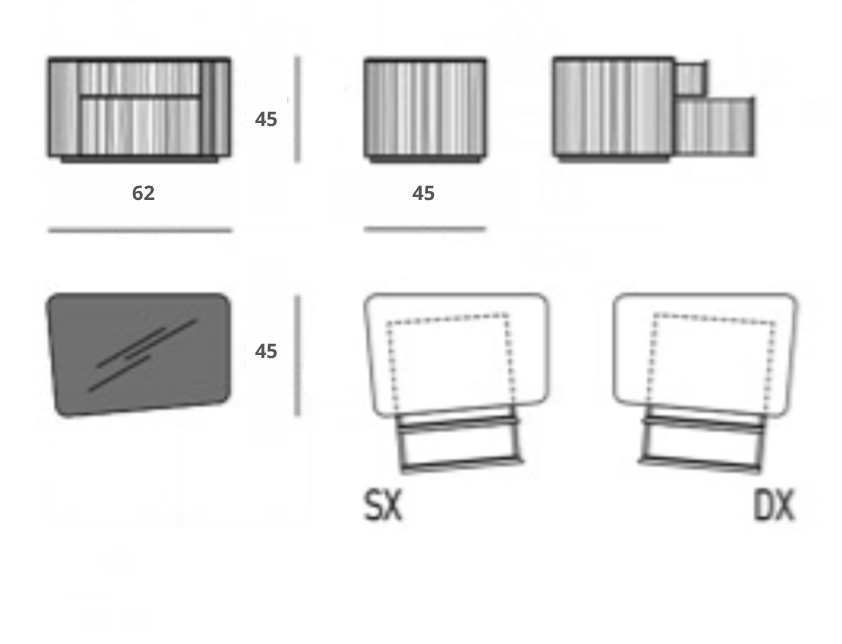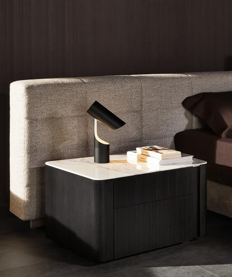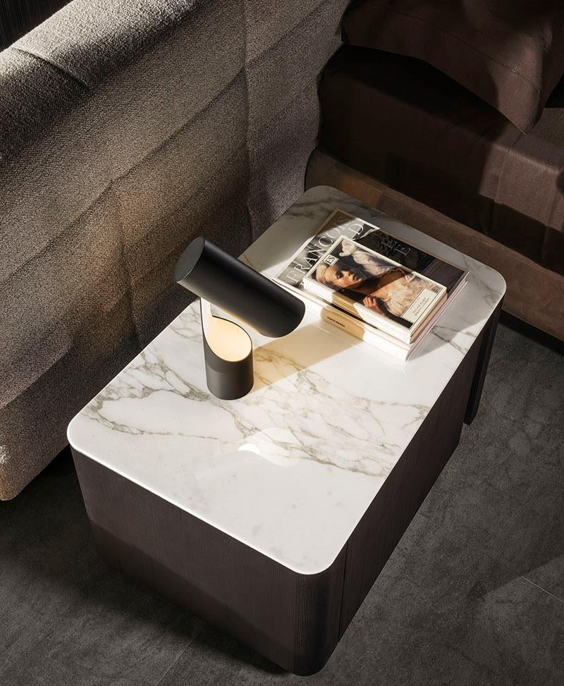 هيكل من الخشب الطبيعي بطبقات متعددة بلون داكن بملمس مطفي مع سطح علوي من رخام الجاز اليوناني الطبيعي تصميم بسيط بحواف منحنية وزوايا ناعمة مزودة بادراج مدمجة و يوجد اتجاهين لطاولة مما يعطي تصميم فريد